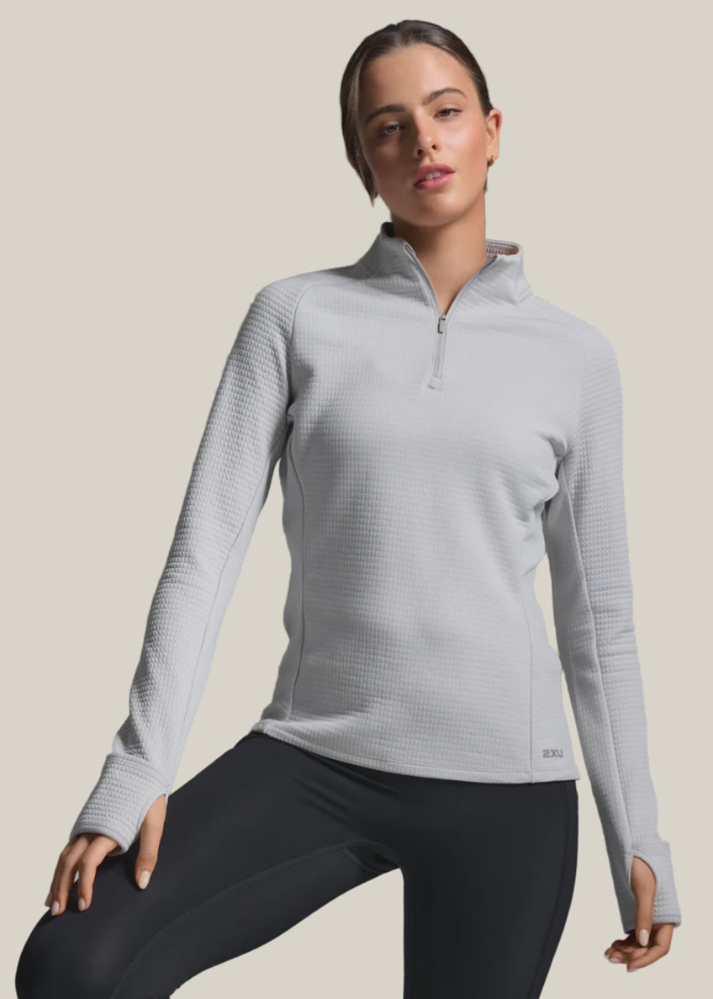 Woman wearing a light gray long-sleeve top against a gray background