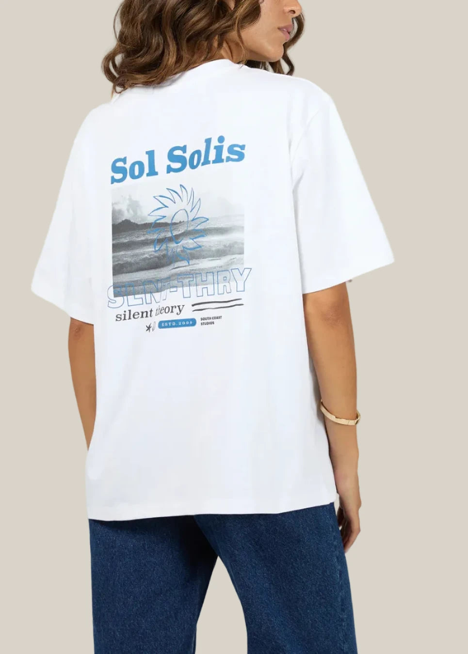 Person wearing a white t-shirt with 'Sol Solis' branding on a plain background