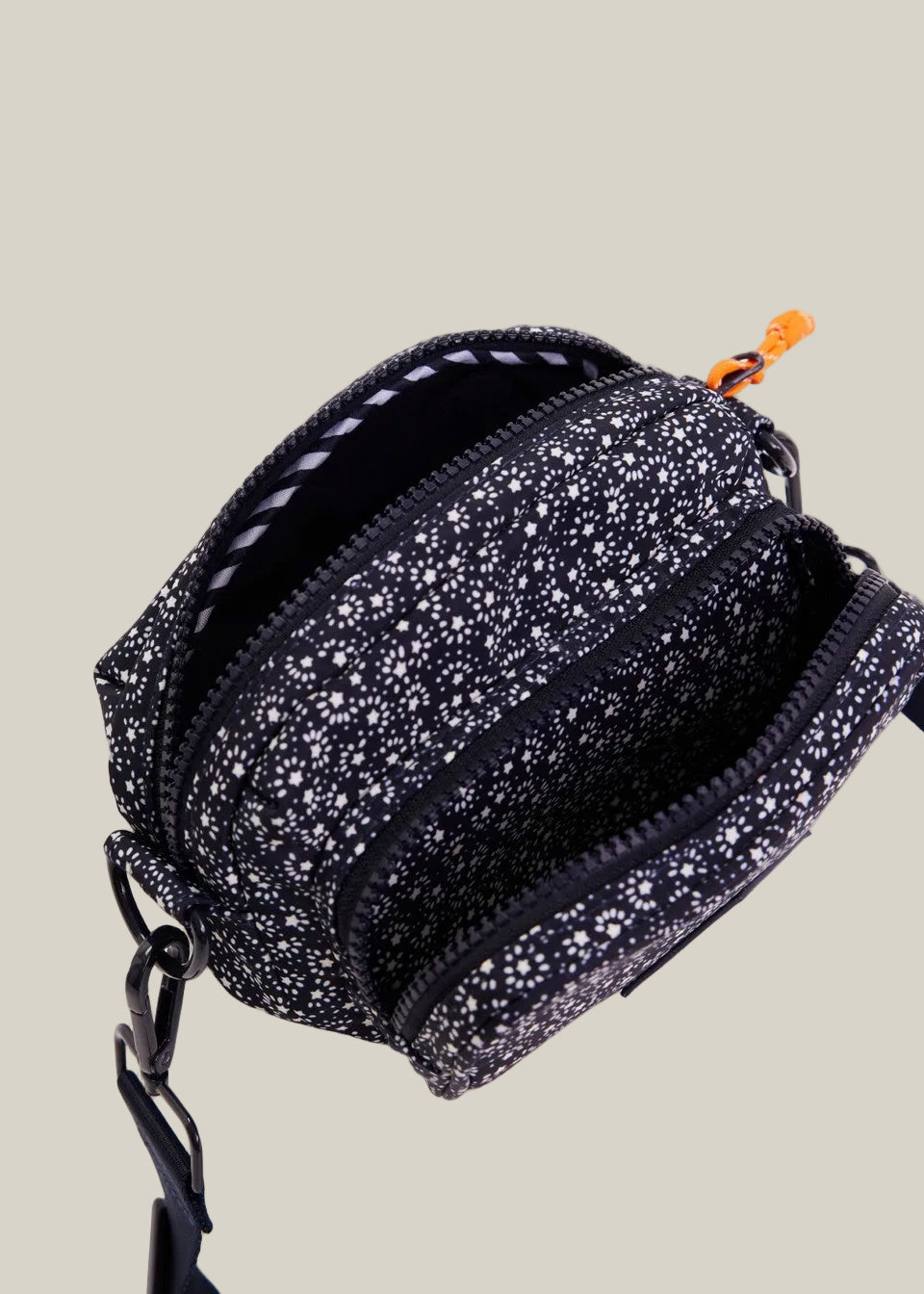 designed for life on the move, this mini crossbody is crafted from recycled polyester and finished in the starlet ditsy print. compact yet functional, it features multiple zip pockets and an adjustable strap for everyday versatility.