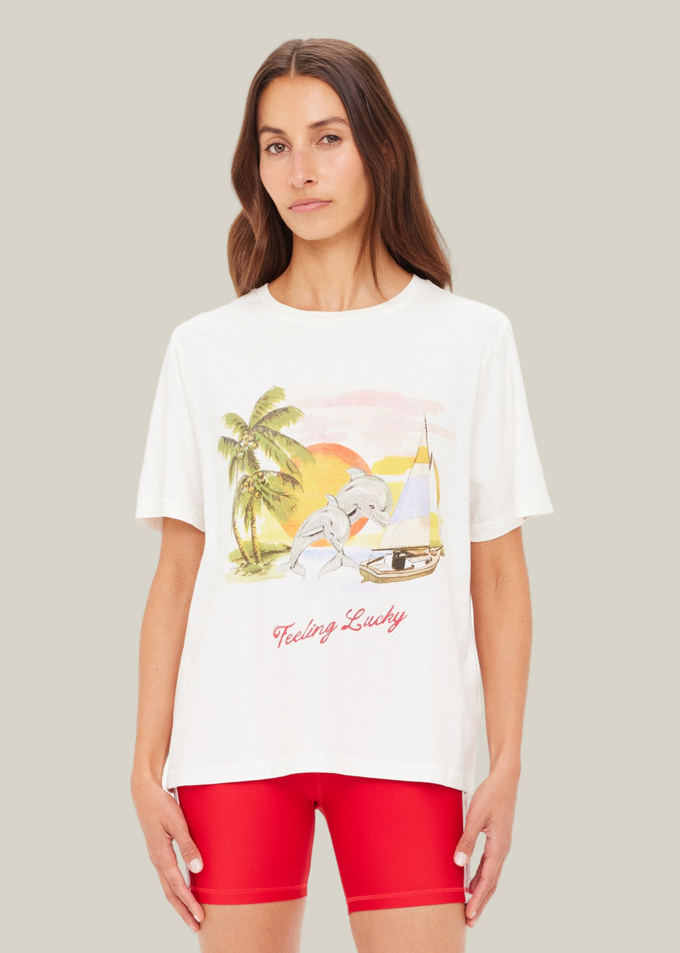 Woman wearing a white t-shirt with a graphic design and red shorts on a white background