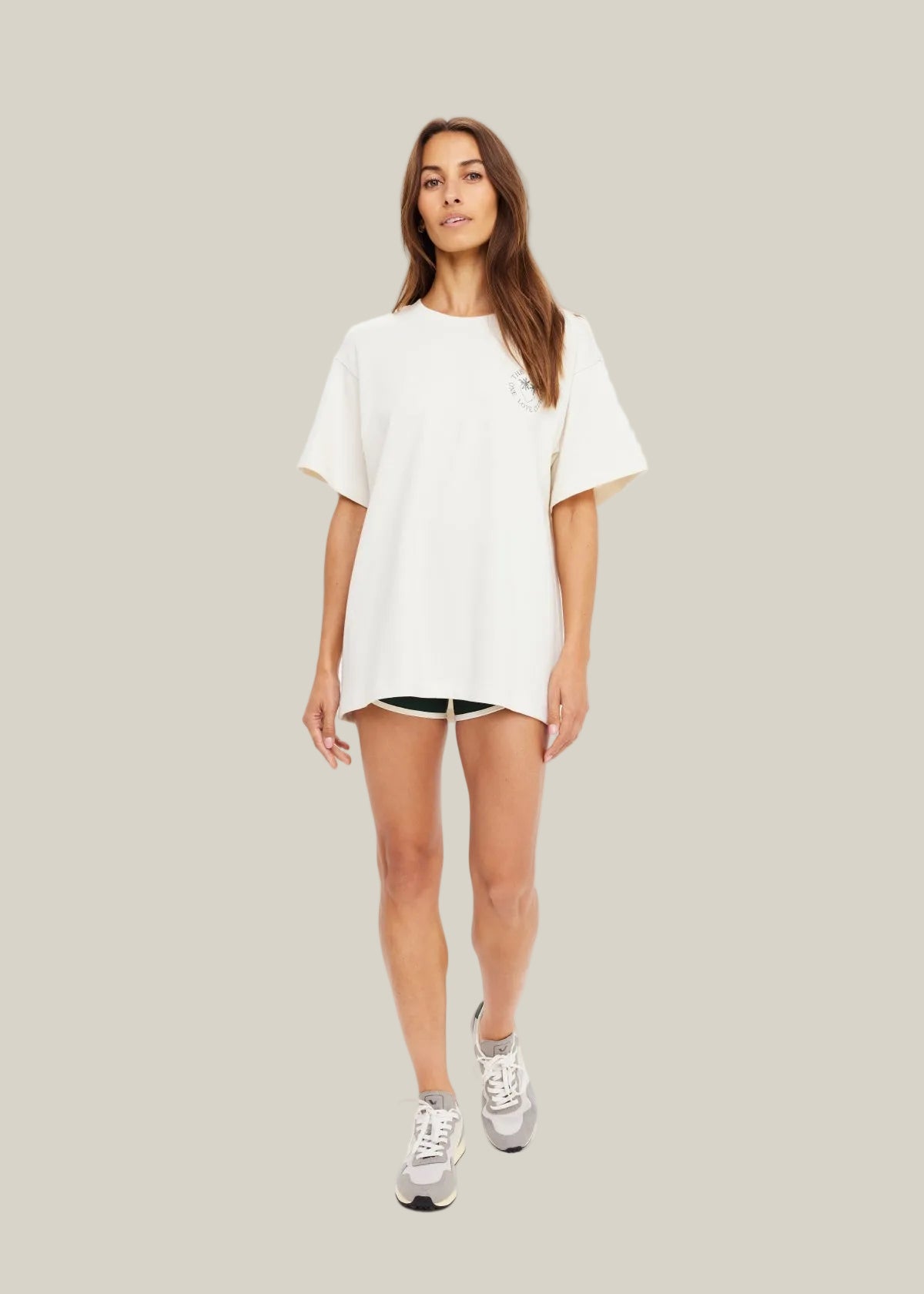 The Molokai Sammi Tee is an effortless, oversized fit tee designed for easy everyday wear. Crafted in a soft cream base, it features a subtle khaki print on the front left chest and a statement large print on the back for a relaxed, laid-back finish.