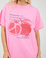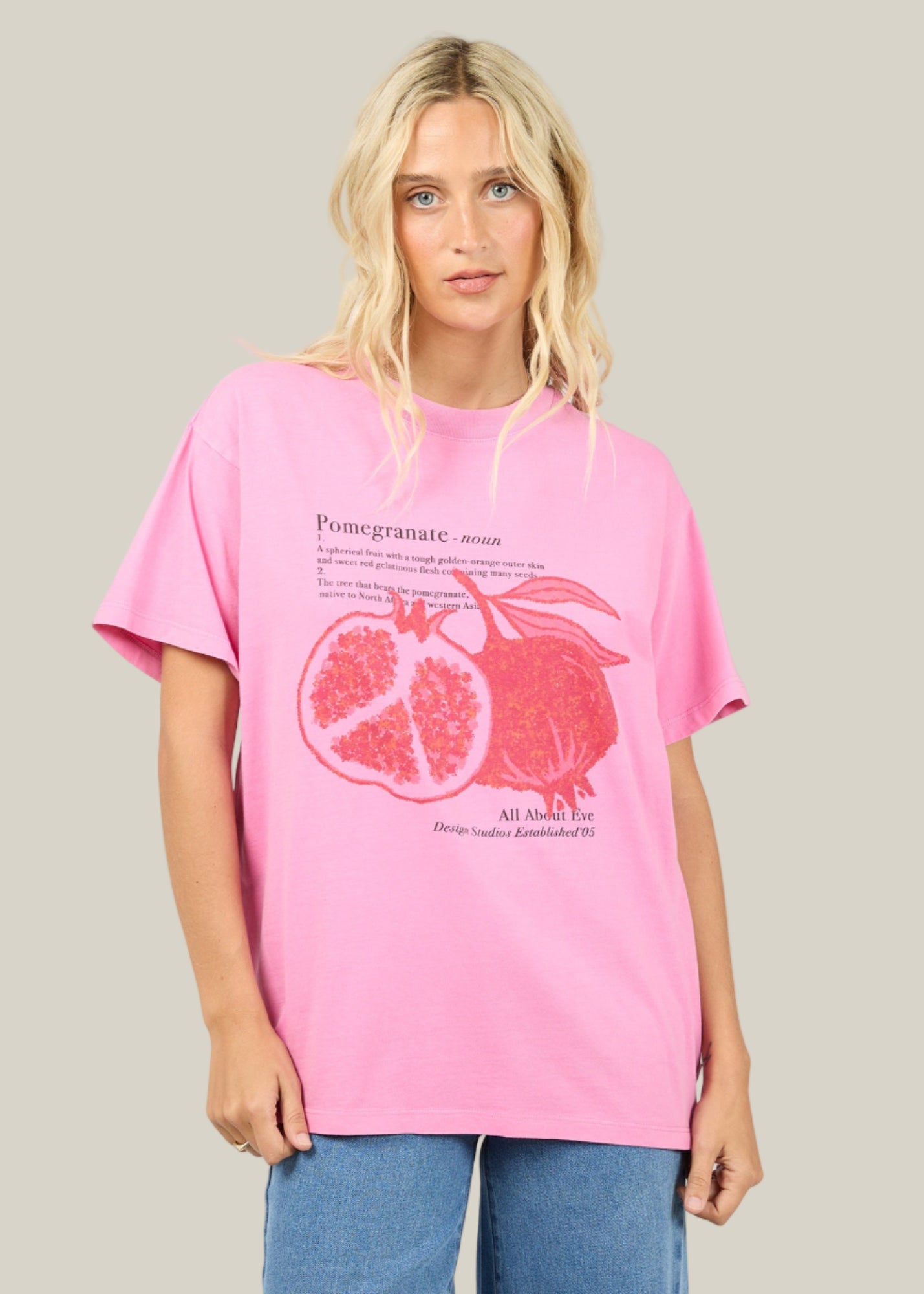 Person wearing a pink t-shirt with a pomegranate graphic on a plain background