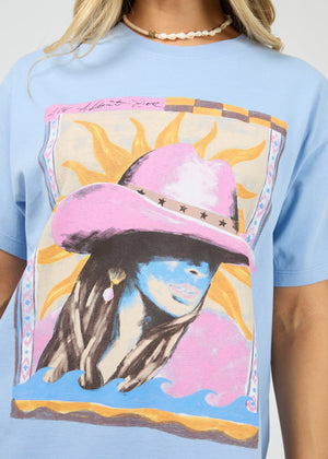A subtle blue hue meets a standout graphic print, giving this tee that perfect mix of ease and edge. Wear it over tights post-Pilates, pair it with denim for street style, or layer it with a hoodie on cooler days.