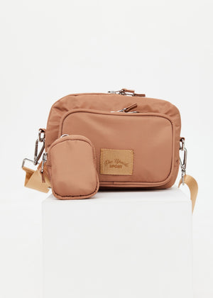 Crafted from recycled polyester in versatile shades of tan, this go-anywhere bag is designed to move with you — stylishly and sustainably.