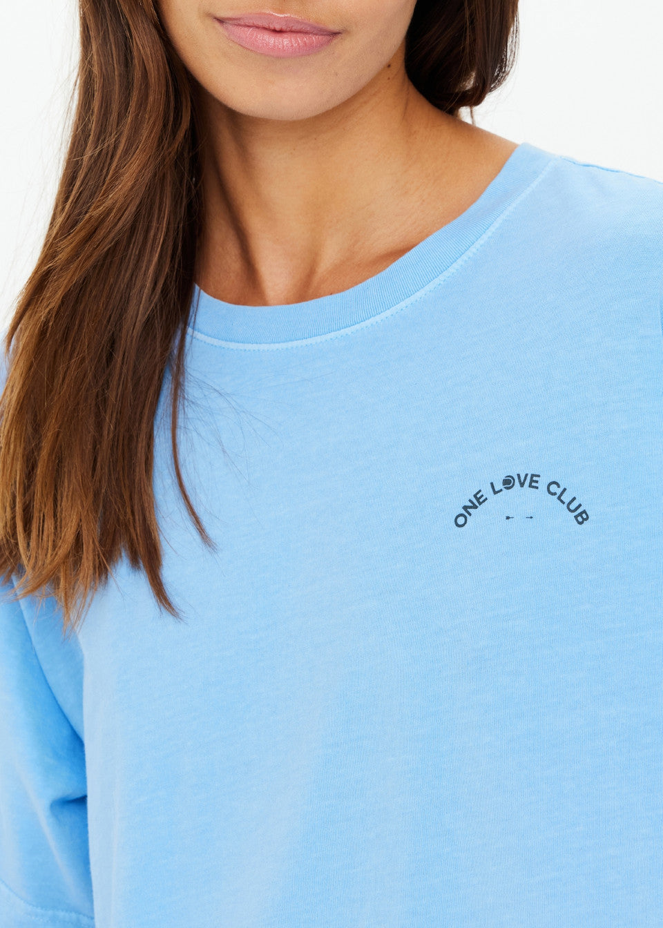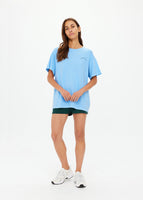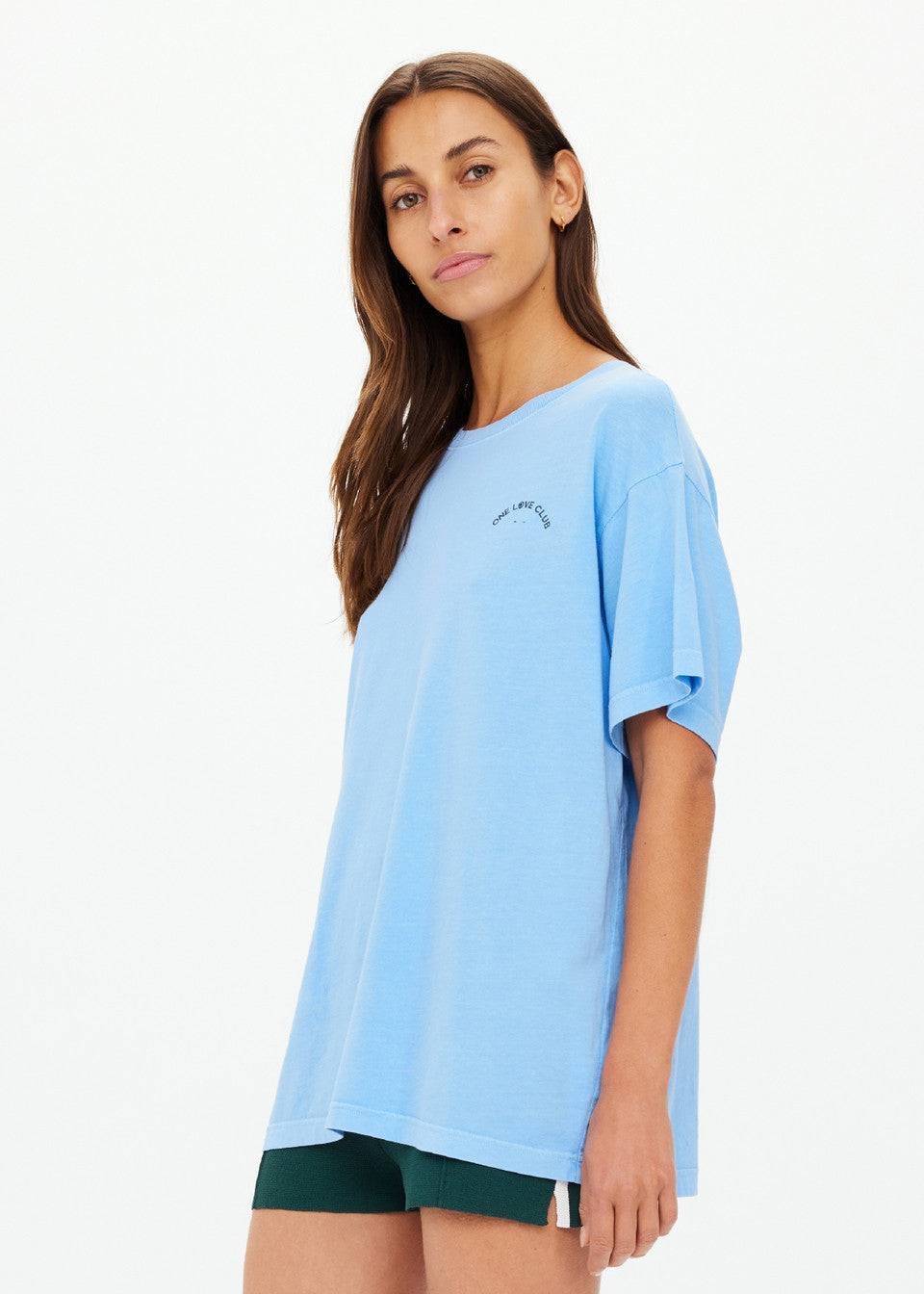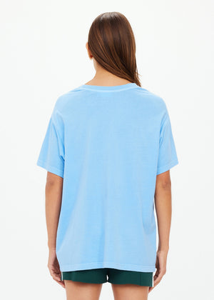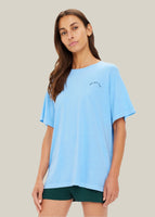 Introducing the One Love Club Sammi Tee by The Upside—a versatile addition to your activewear collection. Crafted from 100% organic cotton jersey, this oversized tee offers a lived-in feel with its overdyed sky blue hue. The front features a vibrant green 'One Love Club' print, complemented by a soft ribbed neckline for added comfort. Perfect for layering over leggings or pairing with your favorite bottoms, this tee combines style and sustainability effortlessly.