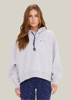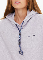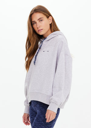 Designed for laidback days and effortless layering, this oversized and relaxed-fit hoodie in grey marle is your new go-to. Western-inspired stitch detailing adds a subtle edge, while the braided paisley cord in blue—finished with silver beads—brings a touch of artisanal charm.