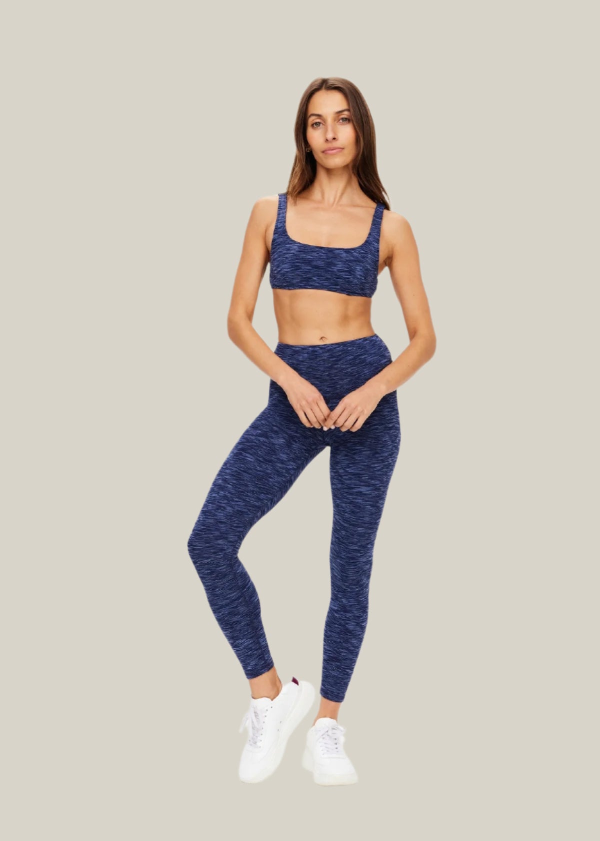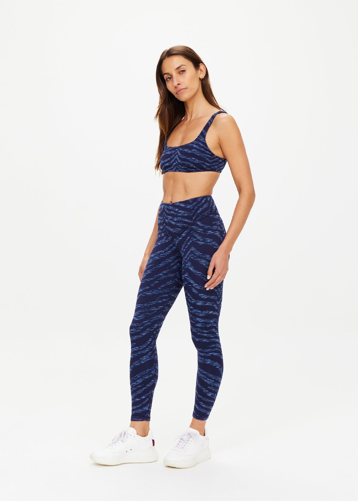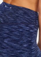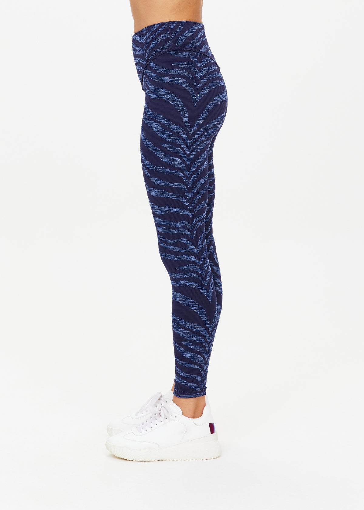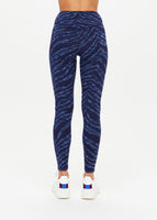 - High rise 25' leg length pant in our exclusive reversible recycled fabrication- Space dye blue yarns with navy textured animal reverse side- Embroidered arrow logo at back - Moisture wicking properties