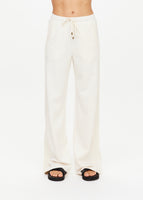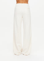 Where comfort meets statement styling. The Nova Flare Pant is a wide-leg silhouette with a subtle flare, crafted in a soft knitted jacquard fabrication featuring a modern cream and white geometric design.