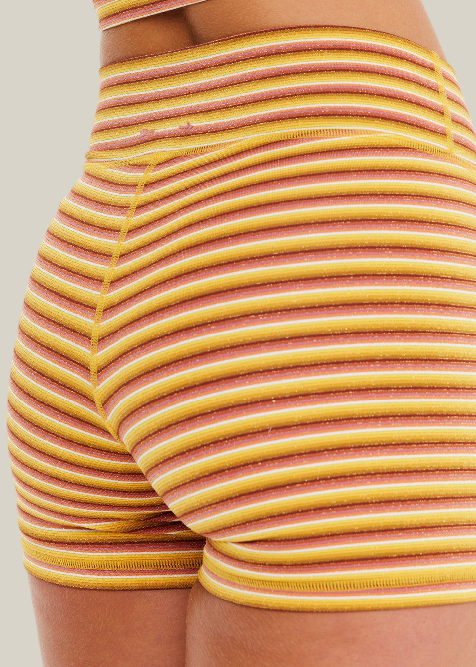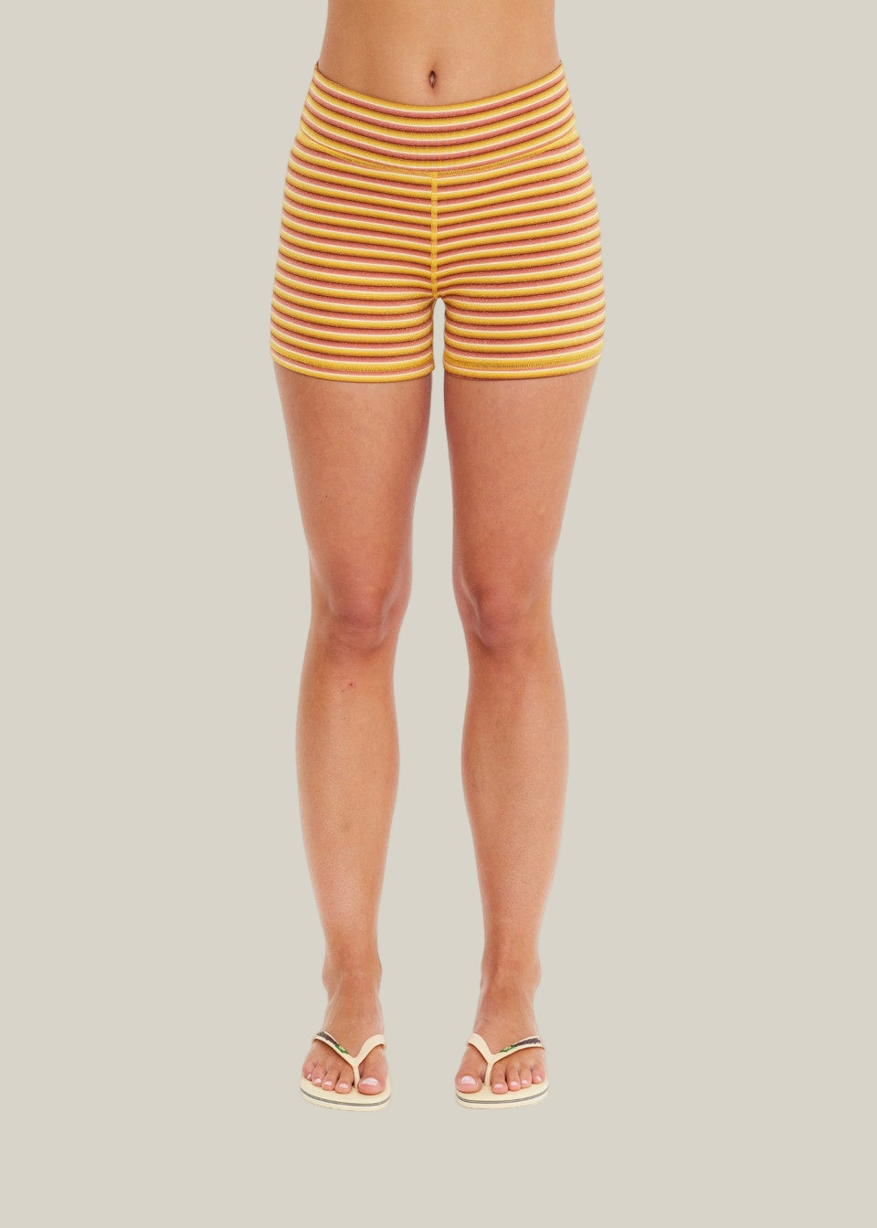 Woman wearing a yellow and white striped tank top and shorts on a white background